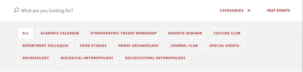 The taxonomy terms on your Past Events landing page are located under the search bar and are used to sort your past events by category. The functionality is the same as it is on the upcoming events landing page. There is also a link to take the site visitor back to the upcoming events landing page.
