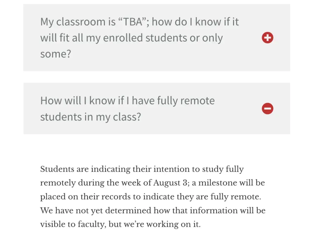 FAQ pages are a great option for lists of information such as major or program details or for a list of questions and answers. An FAQ page has headings with multiple sections/titles nested underneath. The page slides down when a visitor clicks a title to reveal more content.