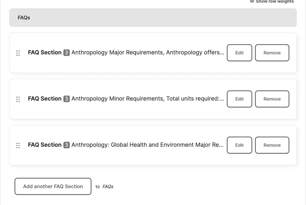 Another way to reorder your FAQ sections is by using row weights. To do this, click on the 'show row weights' link on the top right of your FAQ section. This will open up a 'row weight' on each of your sections and allow you to change the number. The lowest row weight will go to the top, and the larger row weight will be at the bottom.