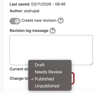 Note: If you have a piece of content that is saved as 'needs review' or 'draft', you will not see the 'published' option. The content must first be saved as 'unpublished'. After the content has been saved as 'unpublished', you will then be able to publish your content.