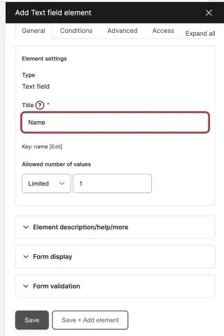 Give your element a name and then click the 'save' button. You must save your element with a name before you can make any edits to your element.