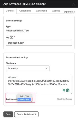 7. On the WYSIWYG in the popup, change the text format dropdown from Full HTML to Plain Text.