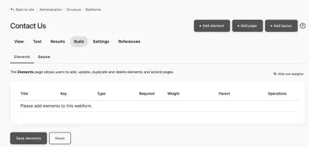 When you are ready to start building your webform, make sure you are on the 'build' screen. Click the +add element button.