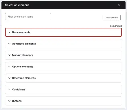 To browse the available elements, make sure you are on the 'build' screen of your webform and then click the +add element button. Elements are divided into seven different sections. You can open and close the dropdown accordions to see what elements are available and their description. If you would like to see what an element looks like, click the 'show preview' button at the top.