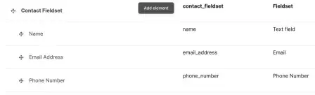 To add a Fieldset anywhere on your form, navigate to your form and click the +Add Element button. When prompted to select an element, go to the Containers tab and open it. The title you choose for your fieldset will also display on the front end and be the title of your grouped fields. To actually place fields within a fieldset, you will need to drag the desired fields under the fieldset element and pull them to the right to indent them:
