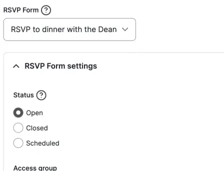 If you pull a webform into an Event as an RSVP or in the Contact Landing page as a Contact Us form, you will have the opportunity to schedule the webform to automatically unpublish. Once you choose which form you will use from the dropdown, the webform setting options will open. At this point, you can set it to be open, closed, or can schedule to open and close on scheduled dates. We highly encourage you to close your RSVP forms once the event is over to help reduce webform spam submissions.