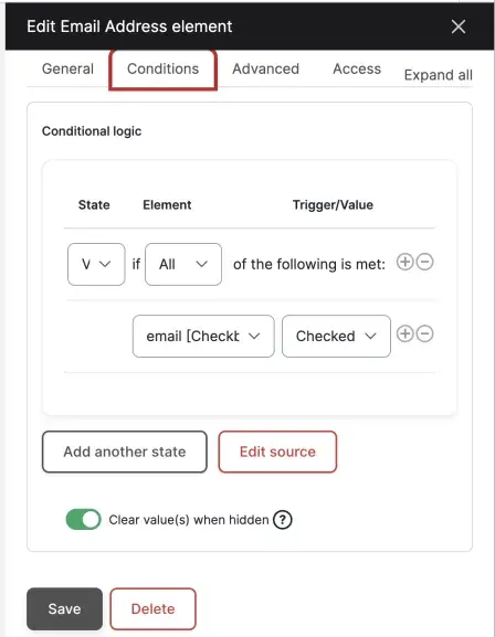 3. While in 'build' mode, click 'edit' next to your email address field and then choose the 'conditions' tab.