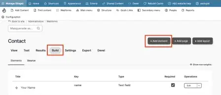 5. Next, go to the Build tab in your webform and click the +Add Element button.