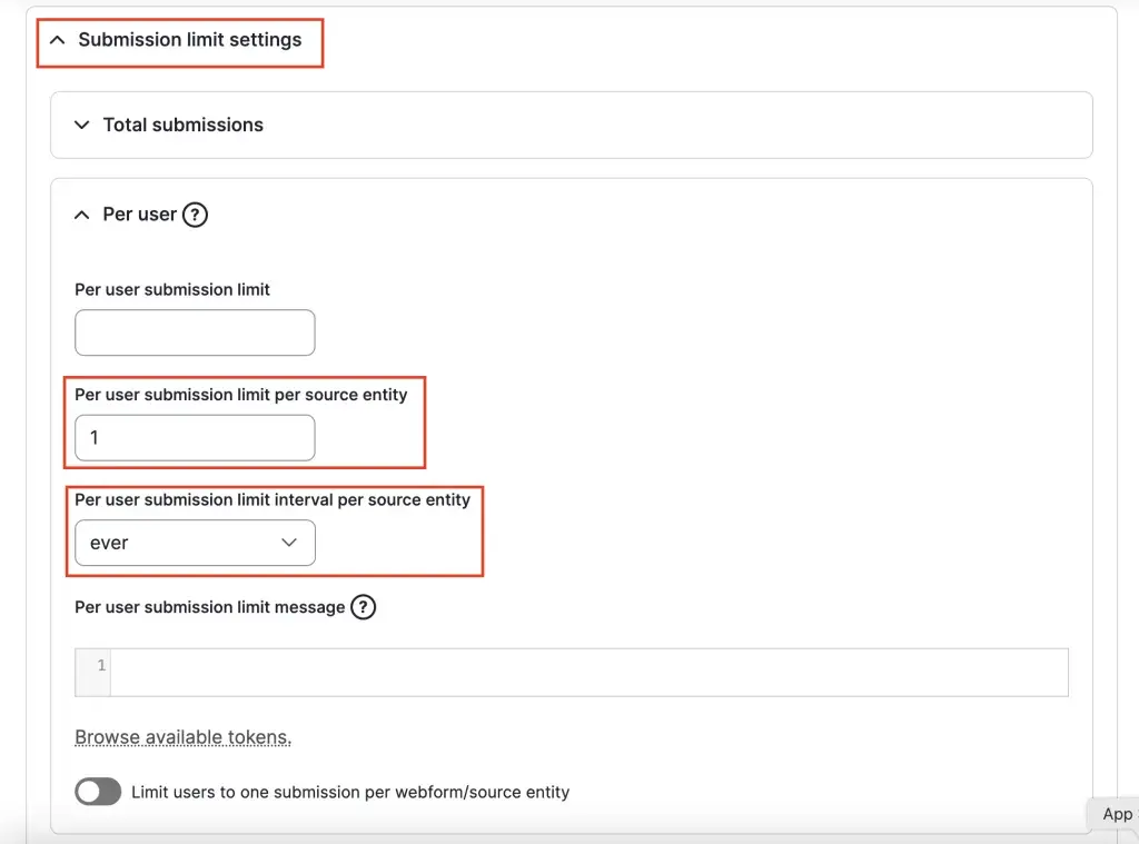 - After you enter a number, the 'per user submission limit interval per source entity' field will open. It automatically defaults to the 'ever' option.