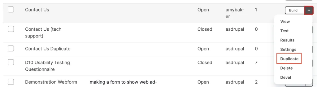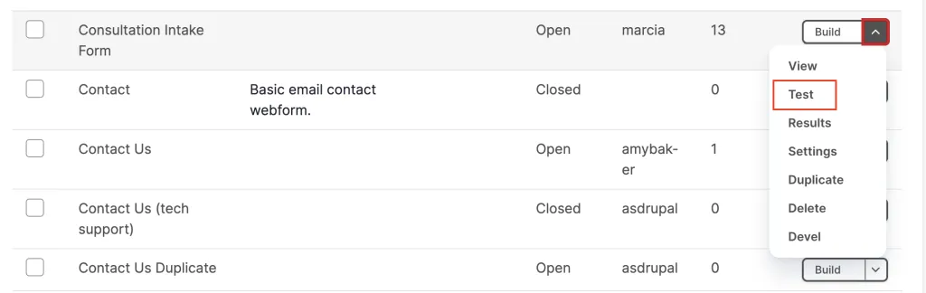 To test your webform, you will just need to go to your list of webforms and find the form you would like to test. Click on the 'build' dropdown in that row and choose the test option.