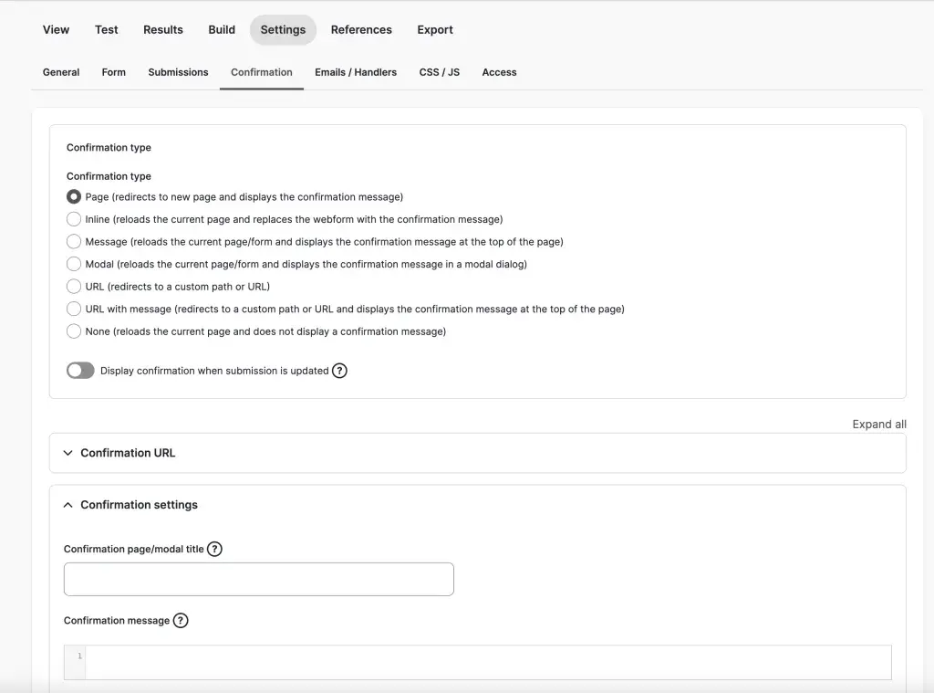 - Under Confirmation Settings, enter your confirmation message in the confirmation message field.