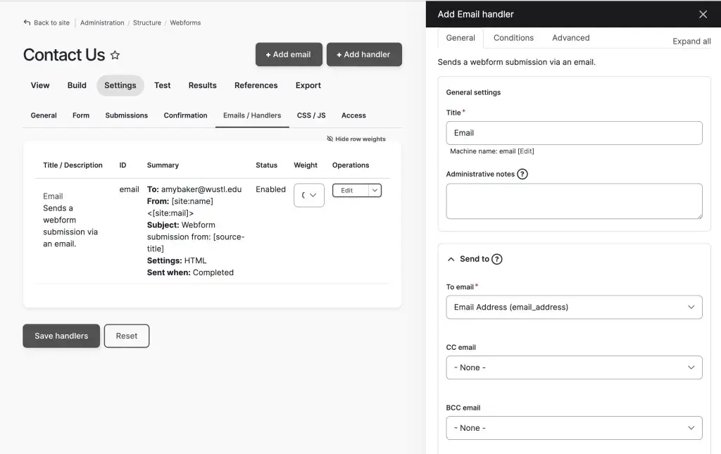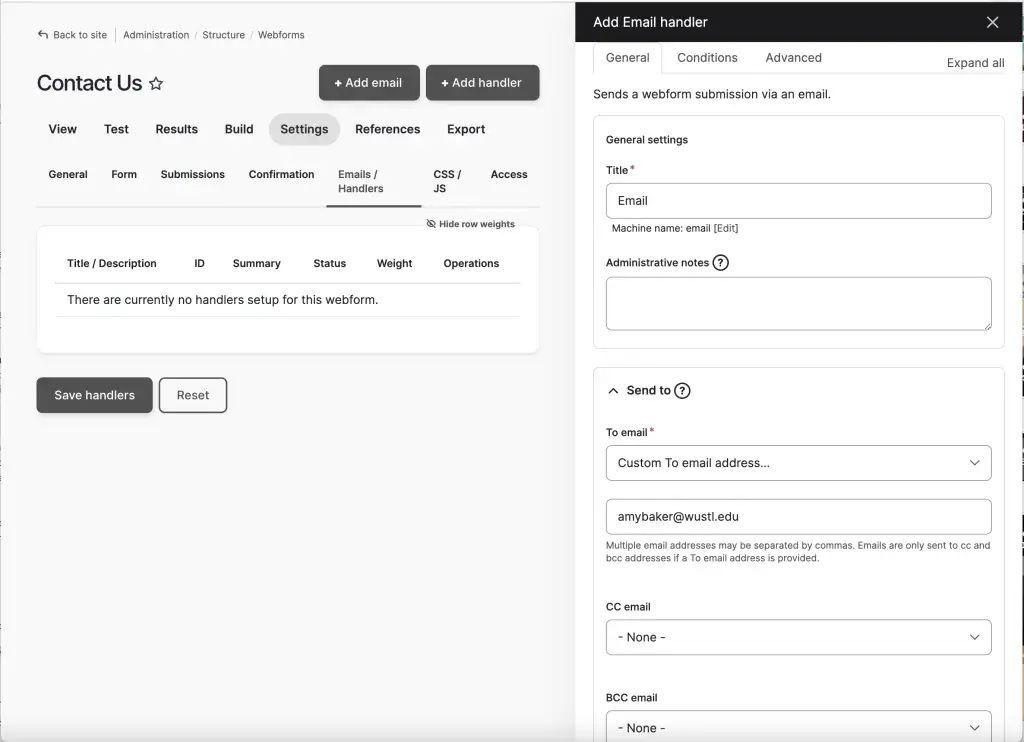 IMPORTANT: Do not change the "from" address option on this screen. Changing that will cause the email to be rejected by the email server most of the time. If you would like replies to go to the person who submitted the form, you may change the "Reply-to" option instead. - Enter the email address of the person who should receive the form submissions. You can add multiple addresses and/or have other people cc'd.