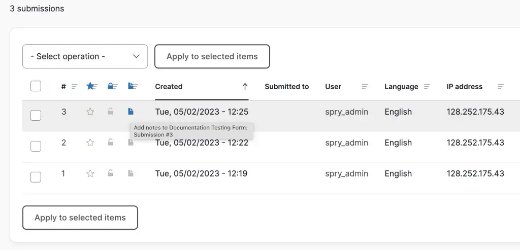 Once there, click on the paper icon next to a submission. This will open a popup window and allow you to add notes or data to the submission. There are also options to lock a submission or star/flag submissions.