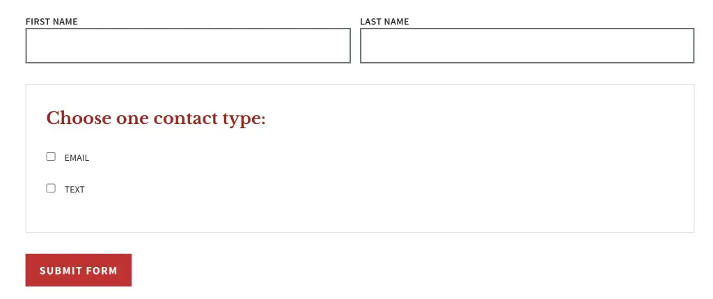 2. Add two more elements after your checkboxes, one for an email address and one for a phone number. These are the two conditional elements since they will only display under certain conditions.