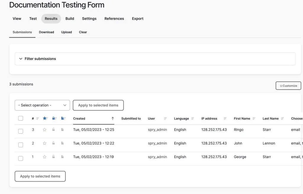 - From here, you will be able to download or export your results, lock, sort, delete, and add notes to the submissions.