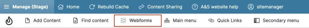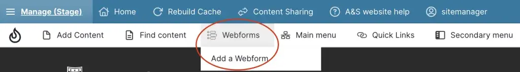 Webforms can be found by clicking on the Webform tab in the admin menu: