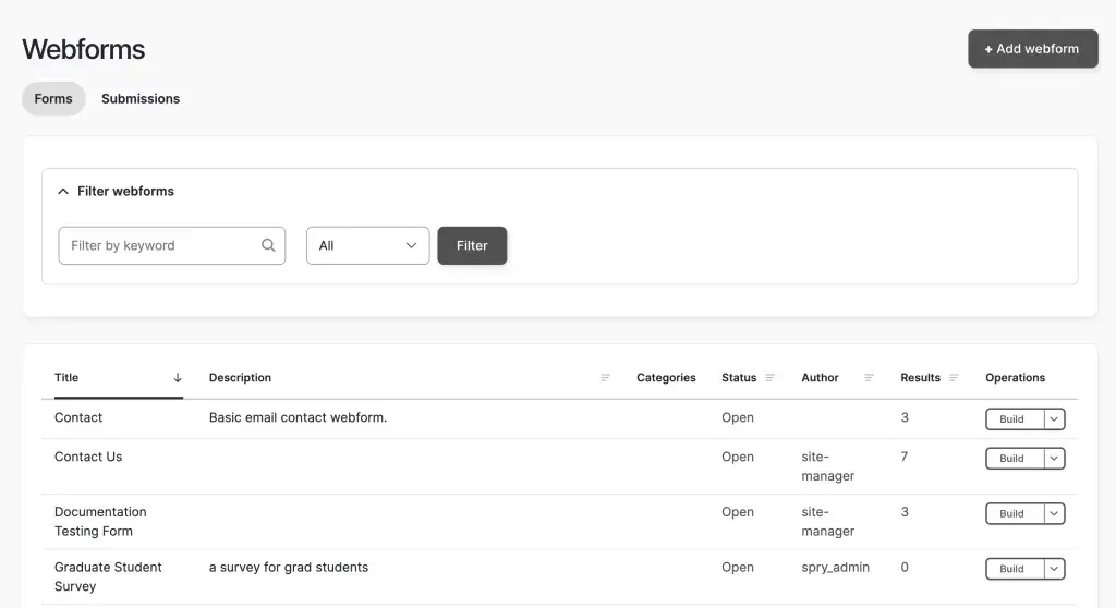 This will take you directly to the Webform overview page which allows you to see all of the webforms in your site. This page will let you view and manage your forms, see webform submissions, and even add a new form.